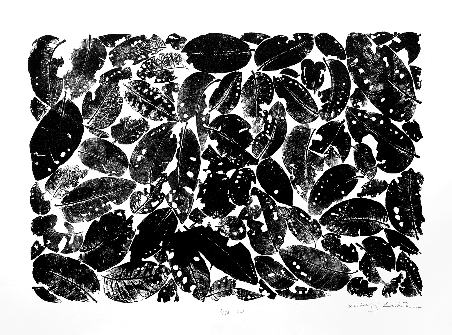 Trabalho de Campo parte da coleta de folhas secas encontradas em caminhadas pelas trilhas de Igatu. O projeto teve início com a monotipia de uma centena de folhas, que em seguida foram organizadas para a composição final do desenho da serigrafia. Neste projeto decidimos criar uma nova tinta com pigmentos refletivos que fizesse referência às pedras de mica encontradas nos rios e cachoeiras da Chapada Diamantina. Como não gostávamos da aparência das tintas glitter de serigrafia, decidimos adicionar glitter ultrafino de cor preta ao processo de impressão artesanal e assim produzimos essa série de tiragem limitada. Todas as serigrafias foram produzidas artesanalmente por nós durante nossa residência no McColl Center, em Charlotte, na Carolina do Norte, entre setembro e dezembro de 2023.