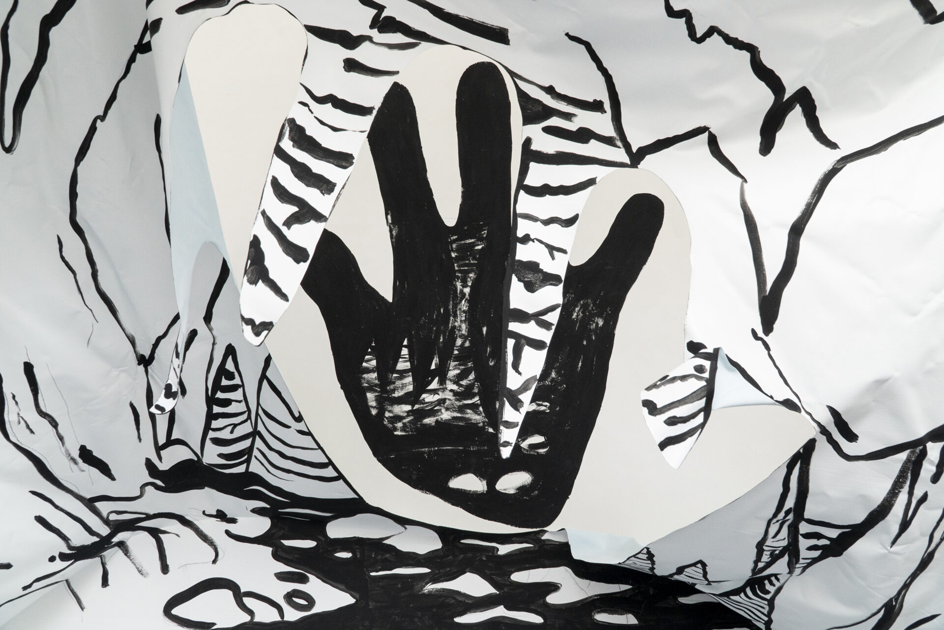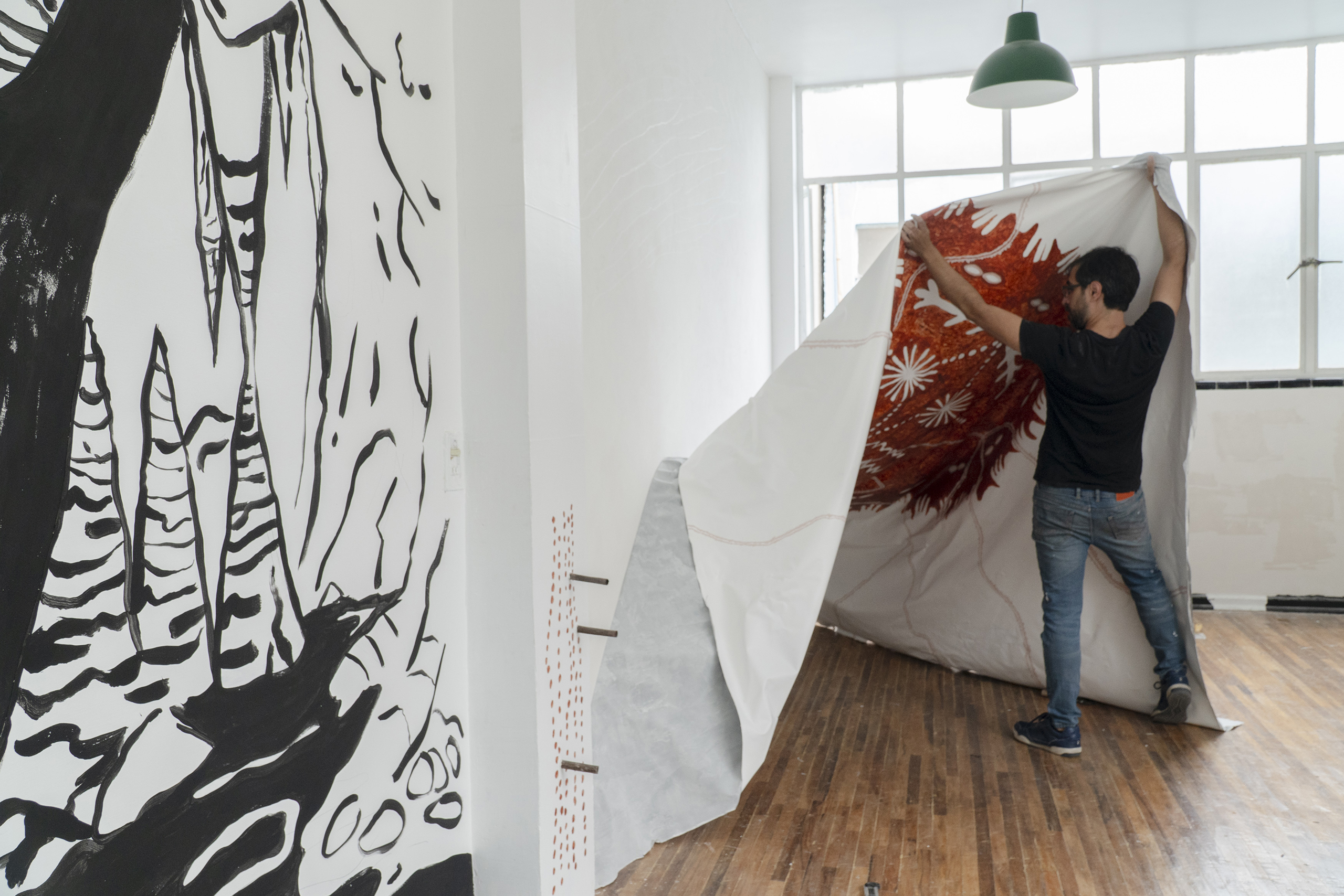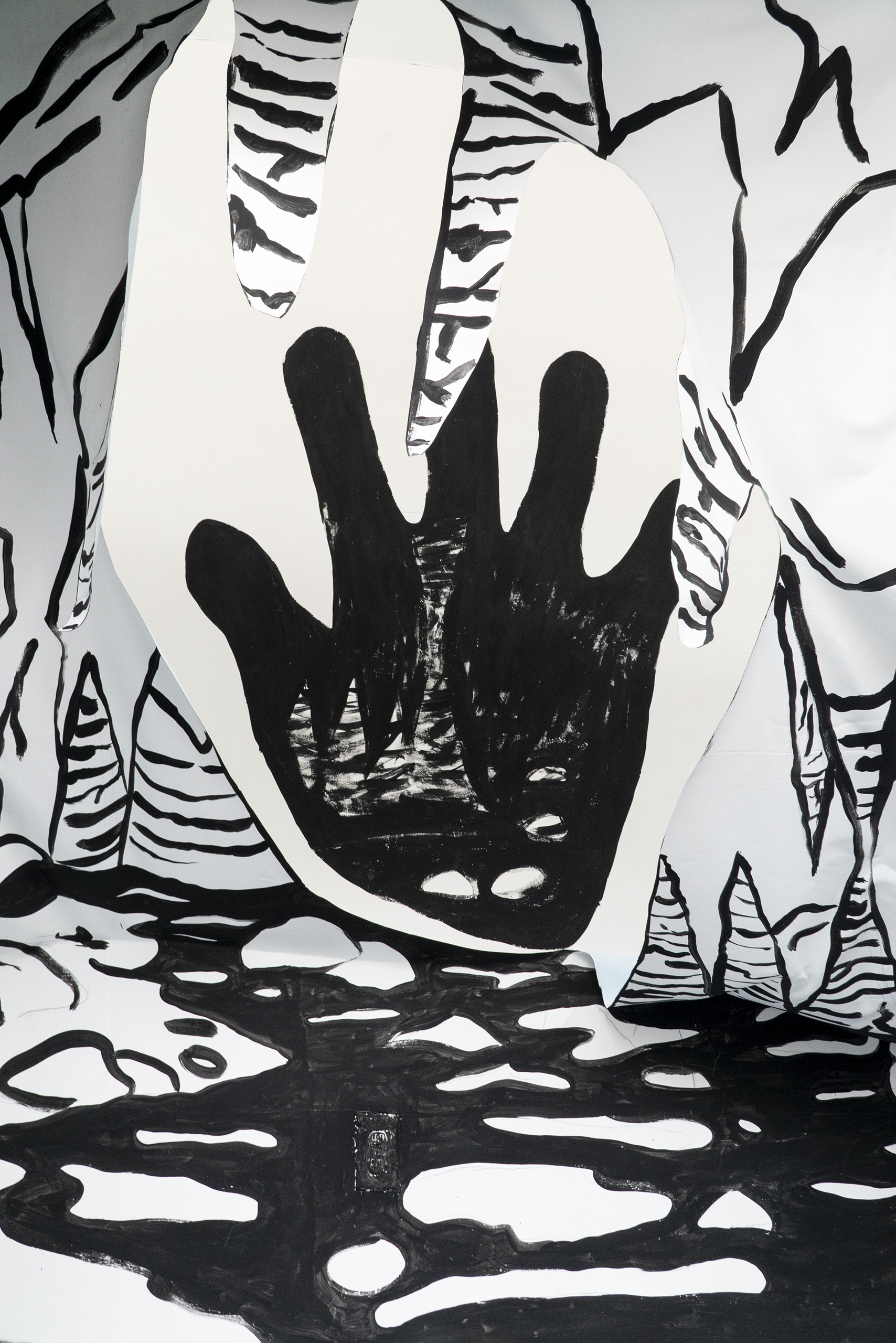 A partir da iconografia das pinturas de mãos ou impressões de mãos em paredes rochosas, inscrições gravadas em diferentes territórios e latitudes, criamos dois murais. O mural preto e branco, a caverna-mão, foi o resultado de vislumbrarmos uma caverna cuja entrada tivesse a forma da palma da mão e ali criamos estalactites, além de um rio que deságua no espaço expositivo. O outro mural, Table-Turning Sun faz referências às mesas espíritas do século XIX e é o resultado de uma colagem com desenhos gráficos de distintos murais rupestres da Chapada Diamantina. Este trabalho dispõe de página específica em nosso site com mais detalhes sobre a sua criação e produção.