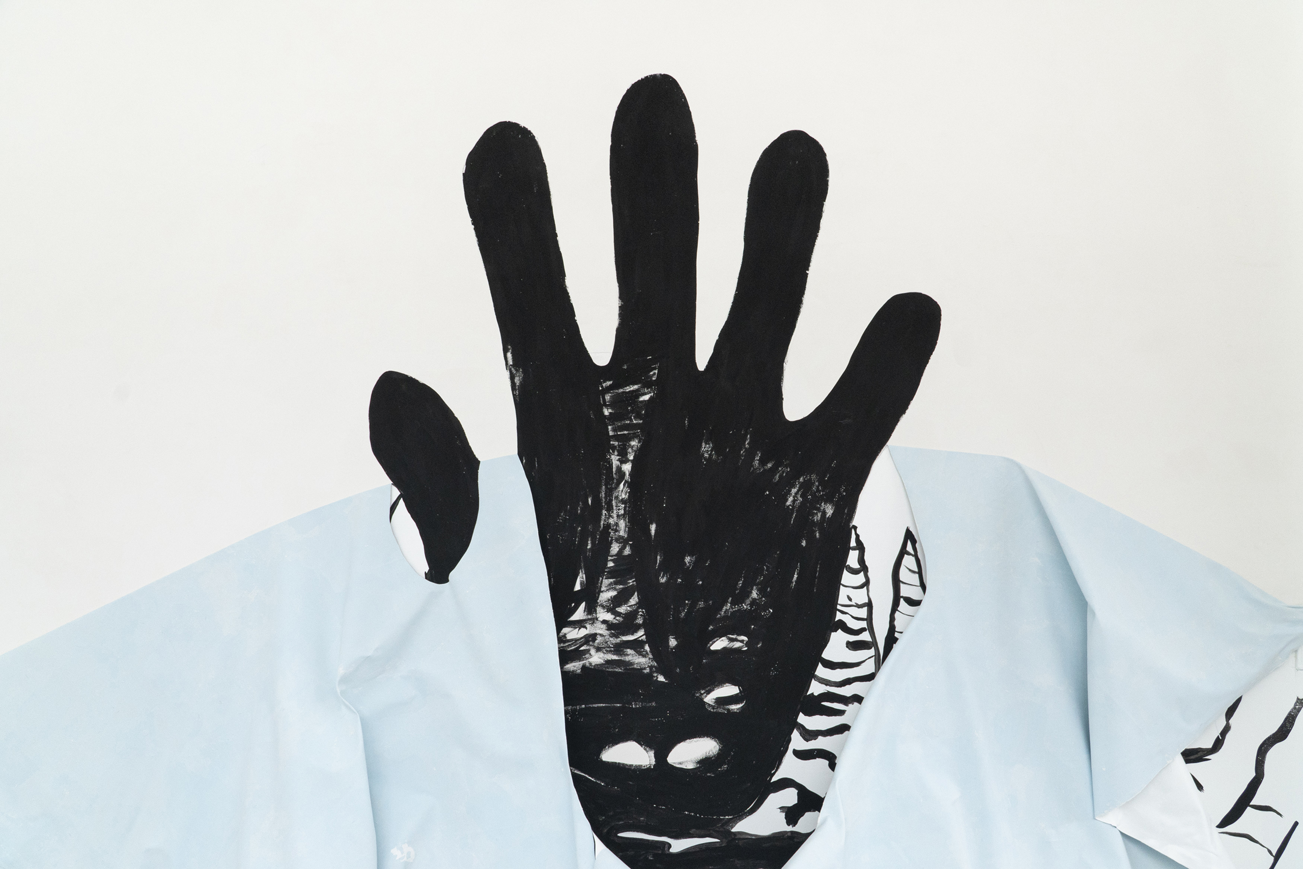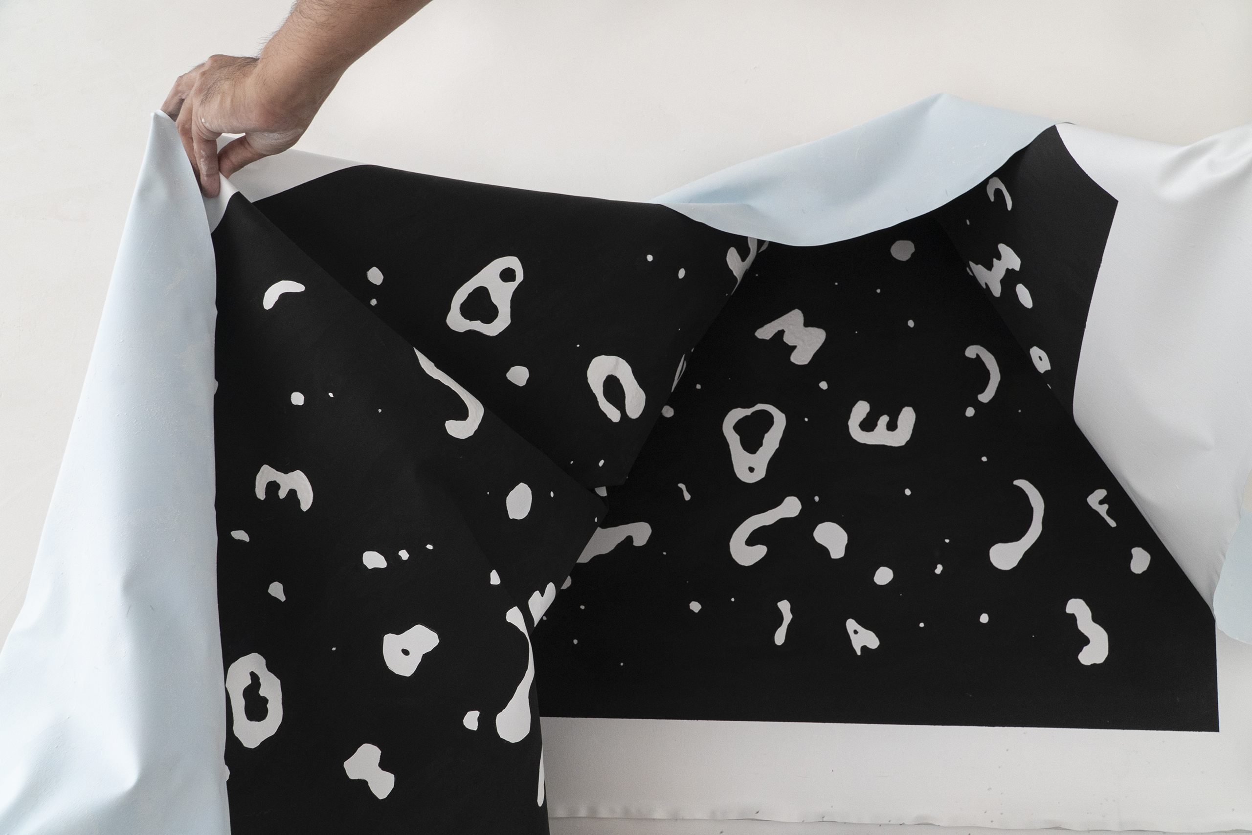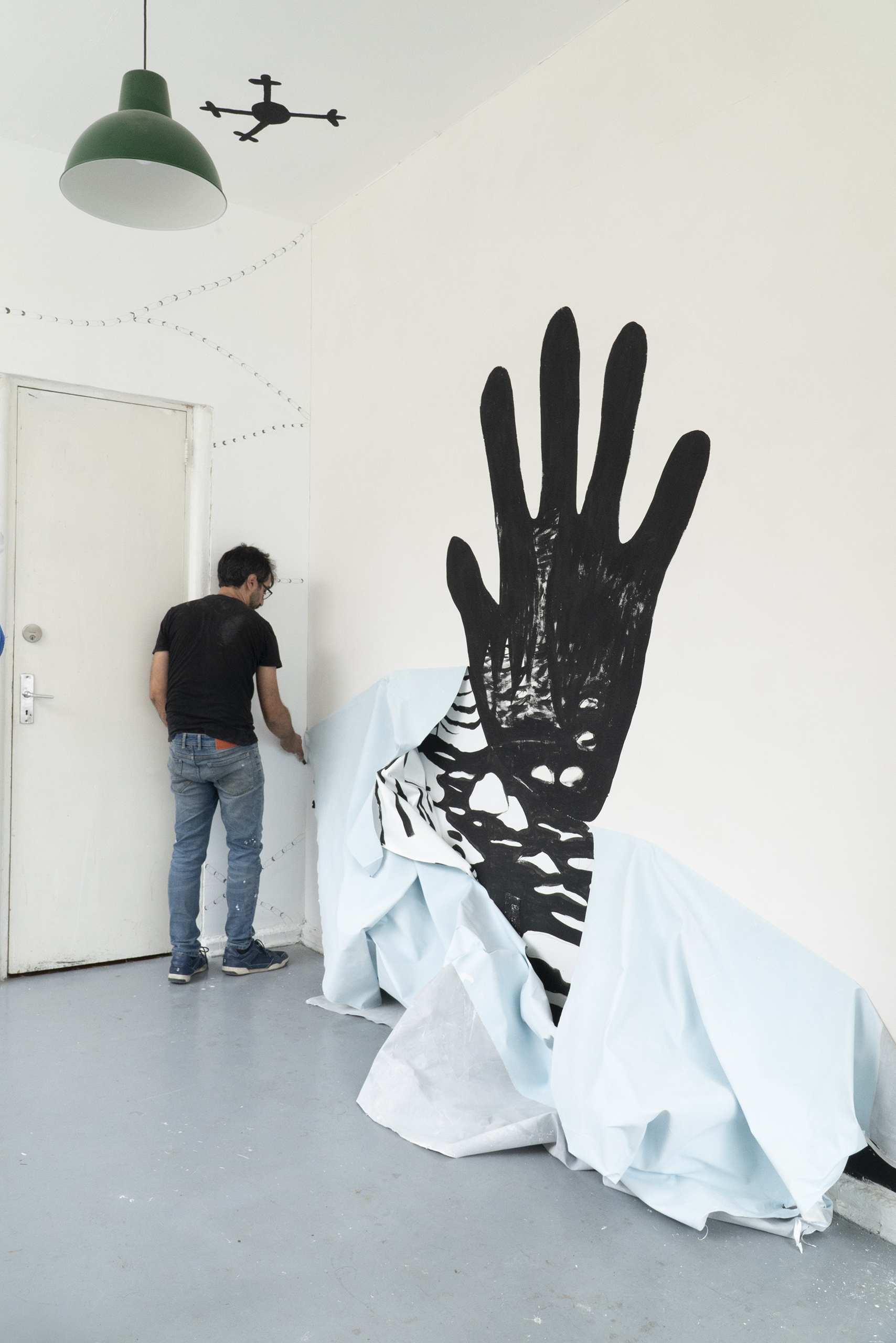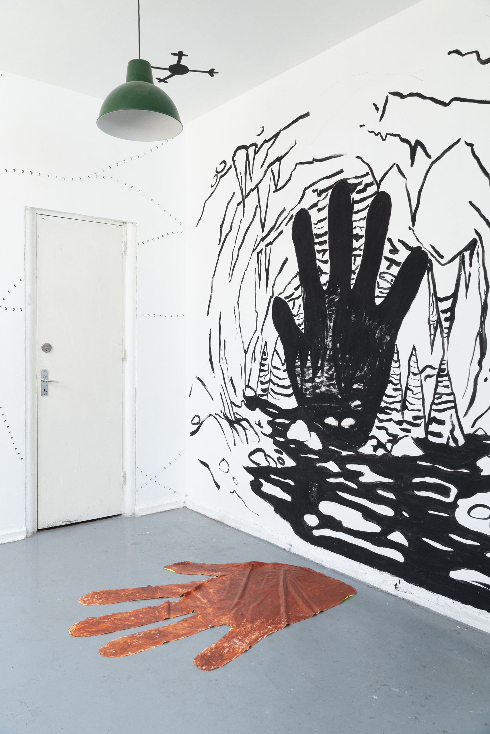 A partir da iconografia das pinturas de mãos ou impressões de mãos em paredes rochosas, inscrições gravadas em diferentes territórios e latitudes, criamos dois murais. O mural preto e branco, a caverna-mão, foi o resultado de vislumbrarmos uma caverna cuja entrada tivesse a forma da palma da mão e ali criamos estalactites, além de um rio que deságua no espaço expositivo. O outro mural, Table-Turning Sun faz referências às mesas espíritas do século XIX e é o resultado de uma colagem com desenhos gráficos de distintos murais rupestres da Chapada Diamantina. Este trabalho dispõe de página específica em nosso site com mais detalhes sobre a sua criação e produção.