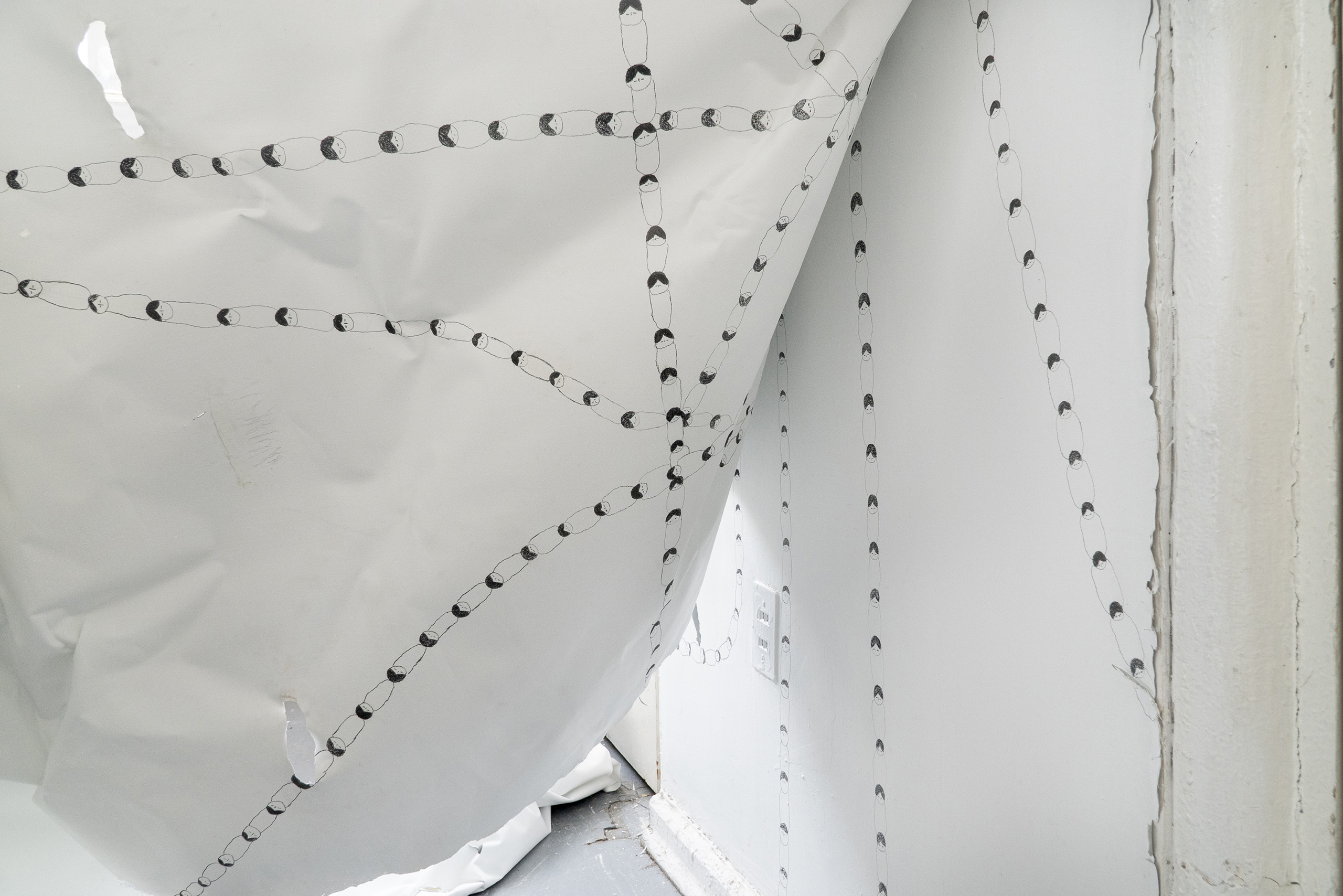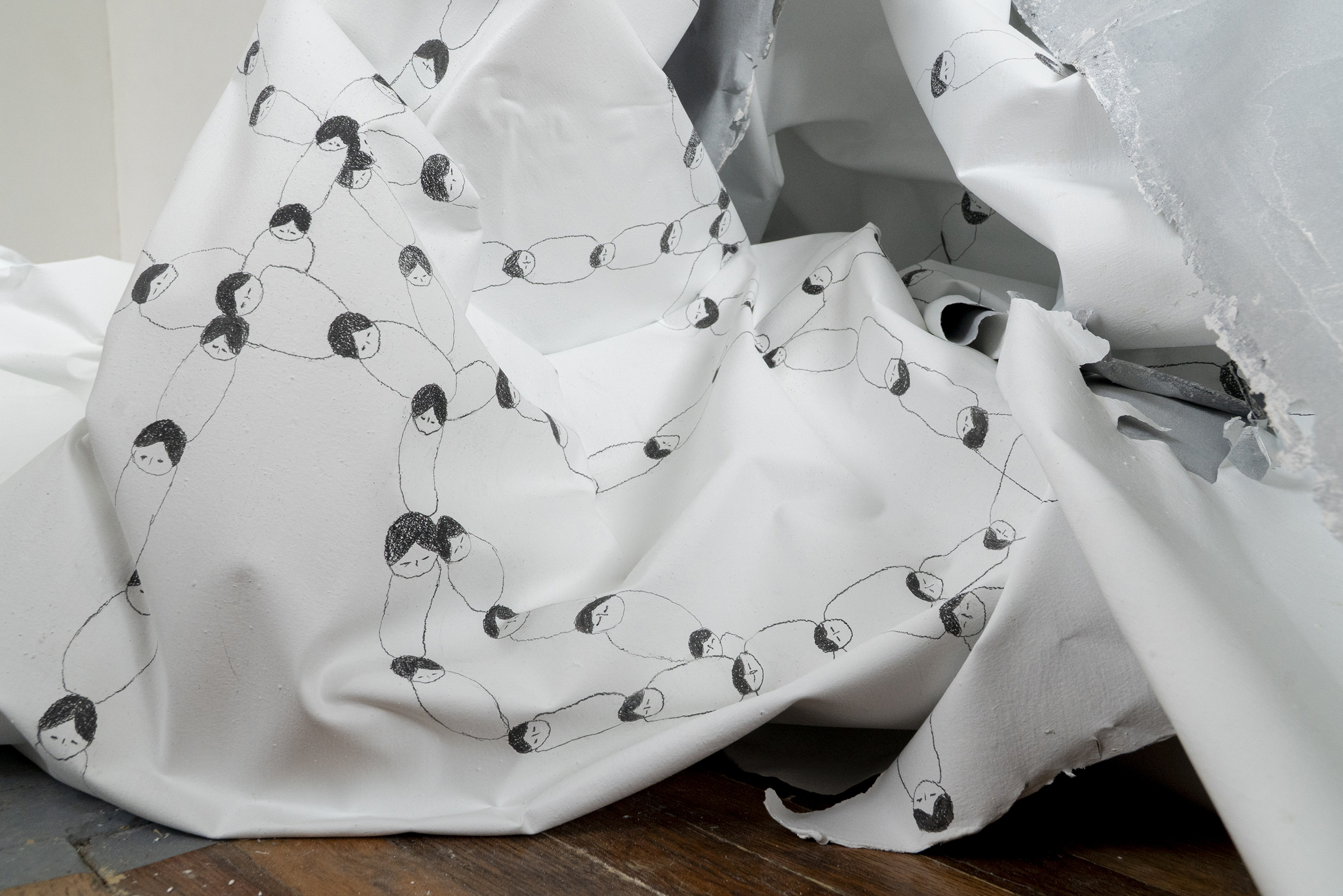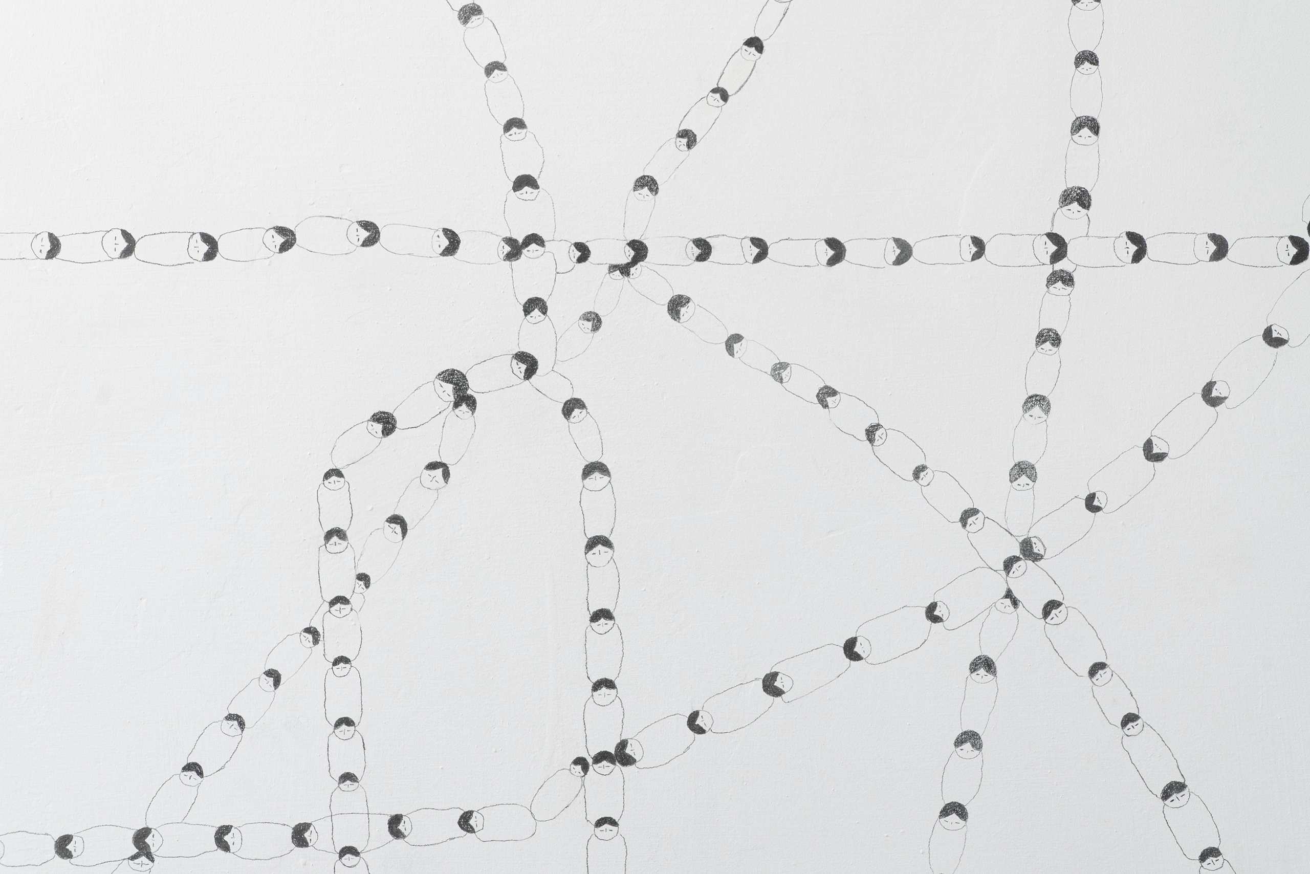 E por último, o painel Trama Matriarcal, desenhos a lápis de tramas inspiradas nos desenhos gráficos criados a partir do consumo da ayahuasca. Um exercício de criação de linhas, que formam cordas e tramas, tecidas com a repetição de um único desenho, o de uma criança recém-nascida.