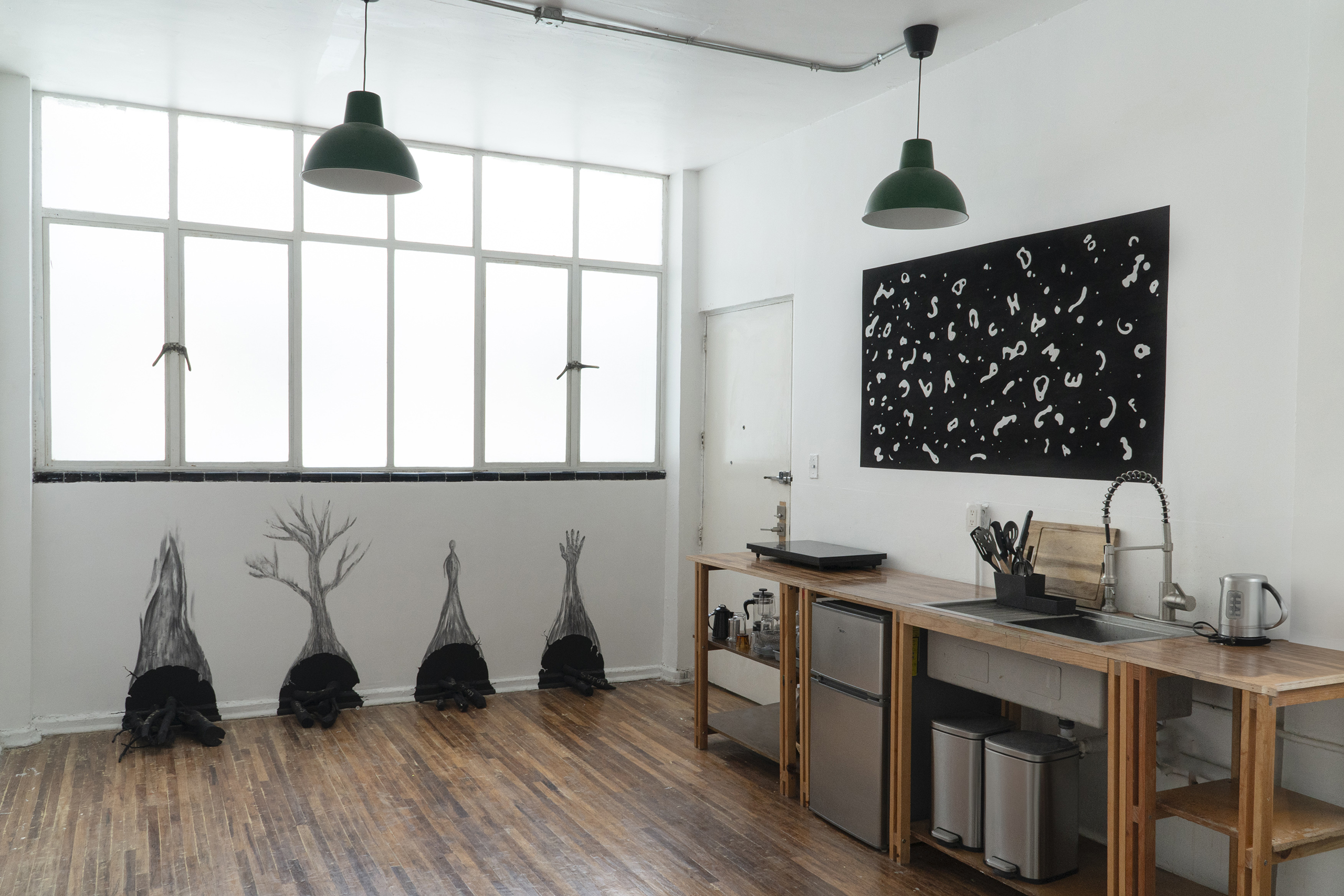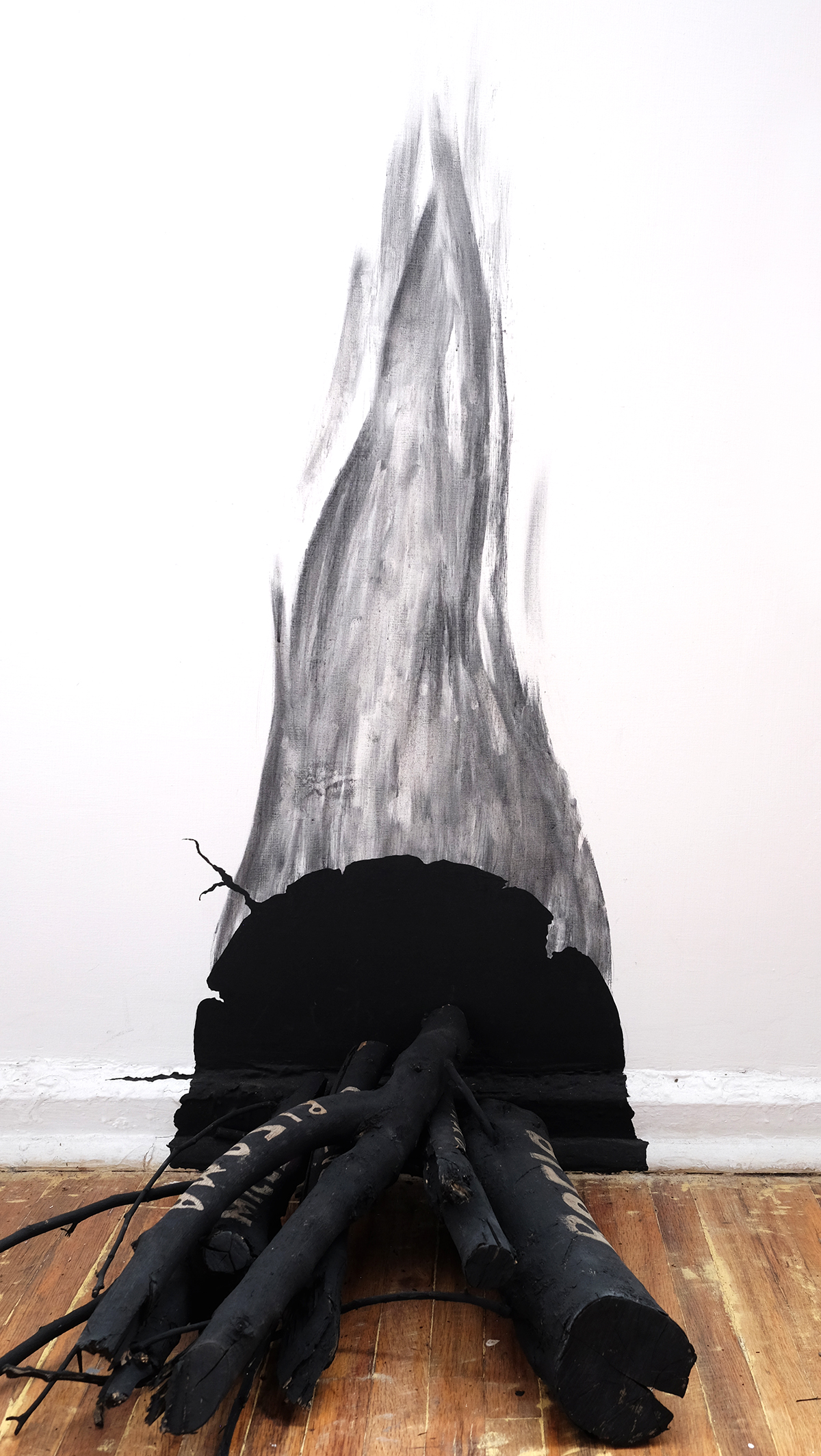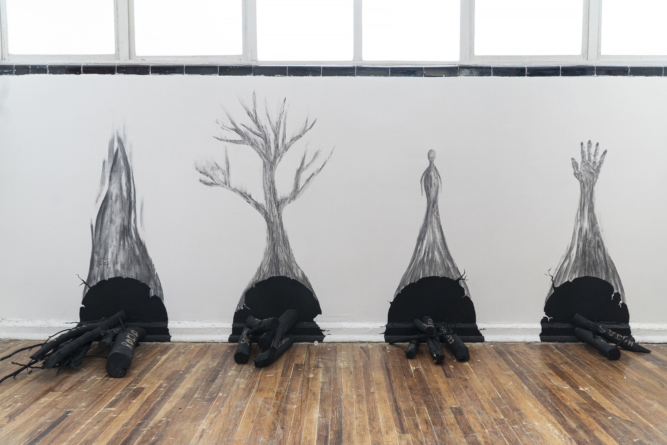 Em outra parede, trabalhamos com carvão, fuligem, tinta acrílica e lenha em uma nova série de quatro pinturas que traz as figuras da mão, do fogo, da árvore e do espírito humano. Um estudo para uma futura instalação de maior escala, na qual temos o desejo de colaborar com poetas que criarão uma peça literária que será consumida parcialmente pelo fogo e reproduzida de modo fragmentado nas lenhas da instalação.