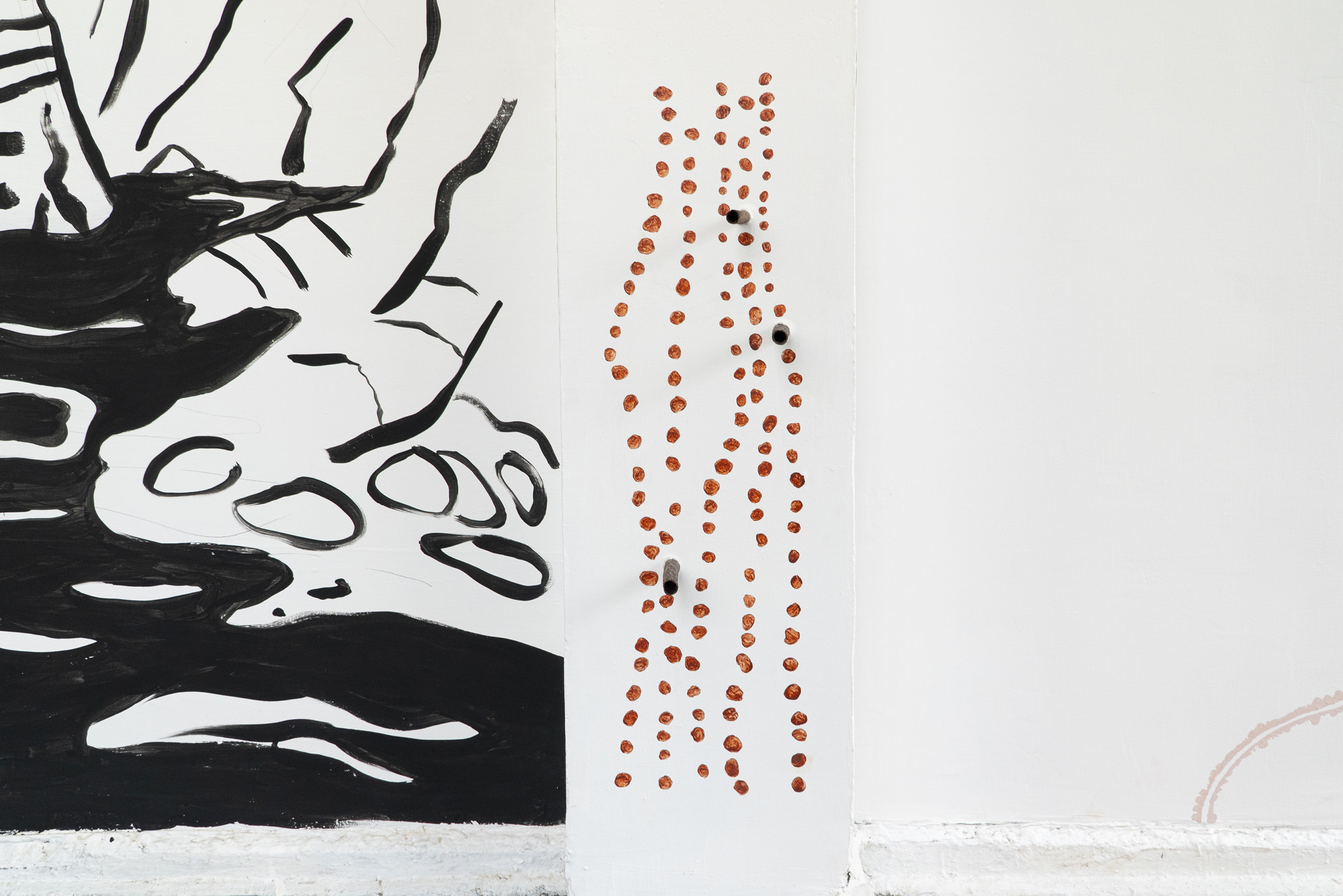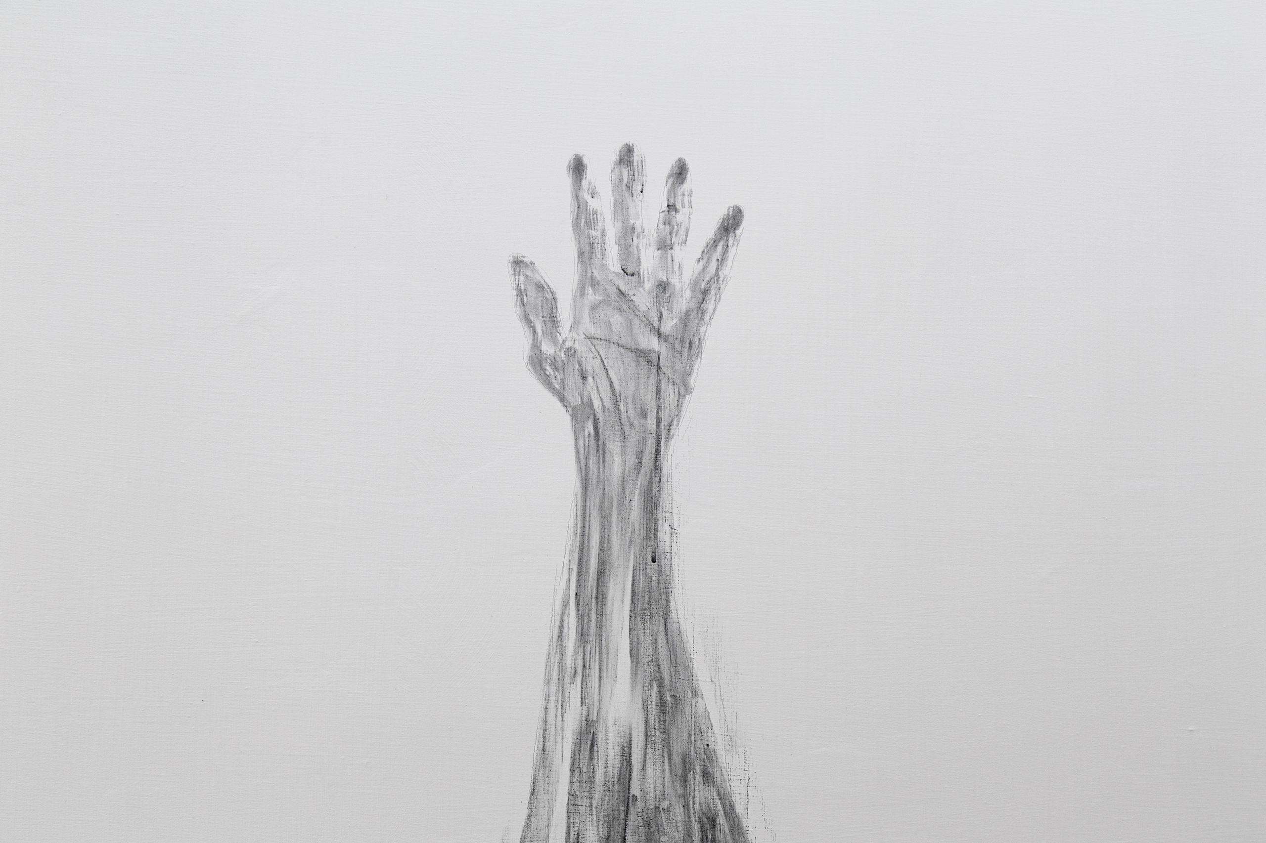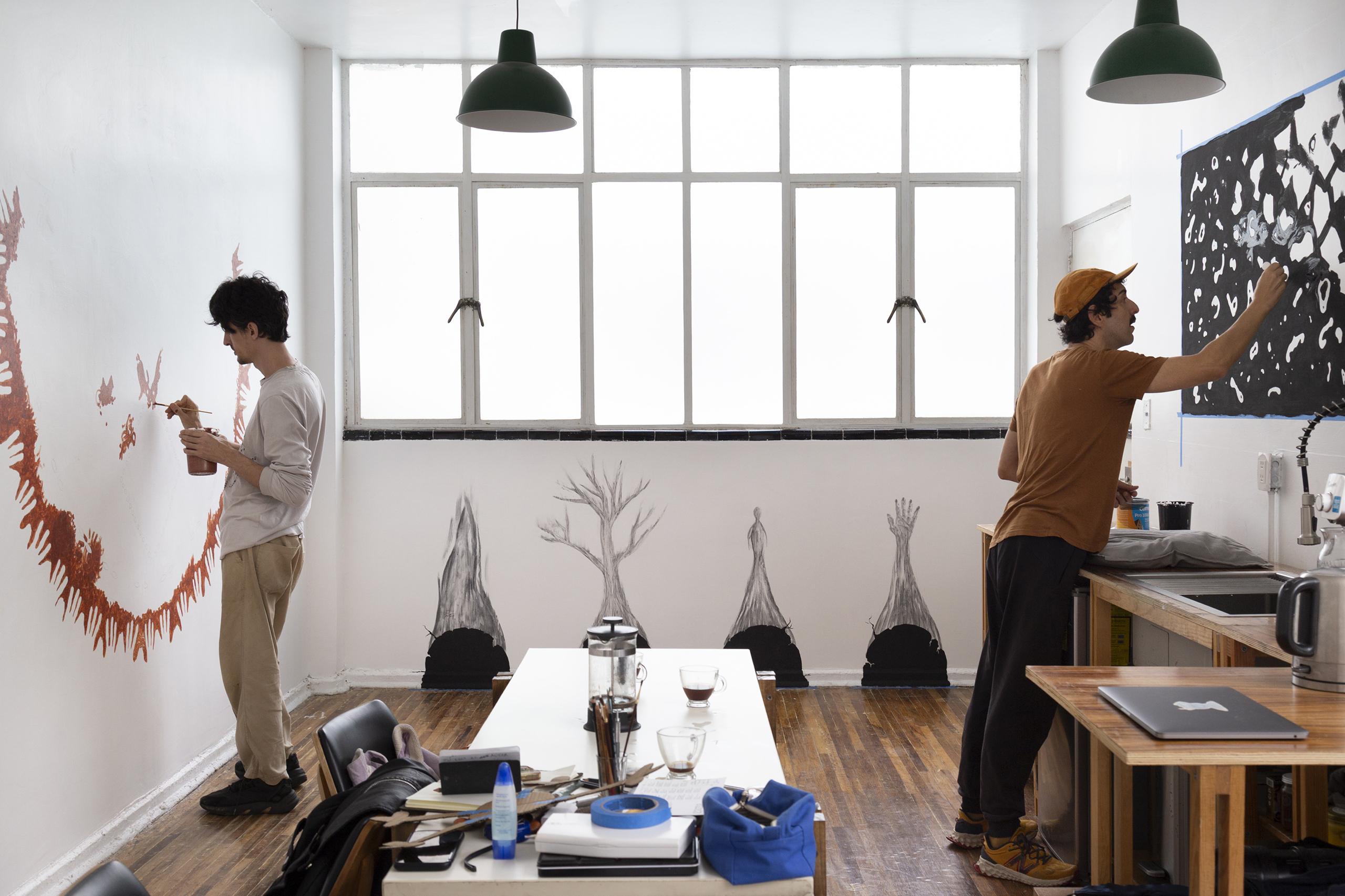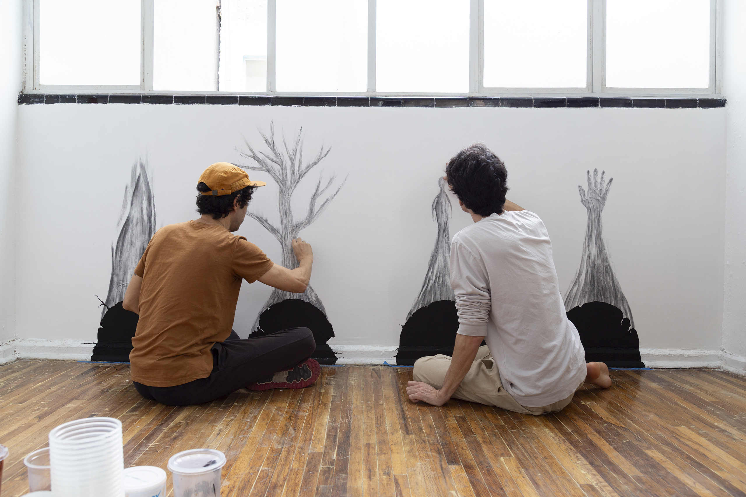 Em outra parede, trabalhamos com carvão, fuligem, tinta acrílica e lenha em uma nova série de quatro pinturas que traz as figuras da mão, do fogo, da árvore e do espírito humano. Um estudo para uma futura instalação de maior escala, na qual temos o desejo de colaborar com poetas que criarão uma peça literária que será consumida parcialmente pelo fogo e reproduzida de modo fragmentado nas lenhas da instalação.