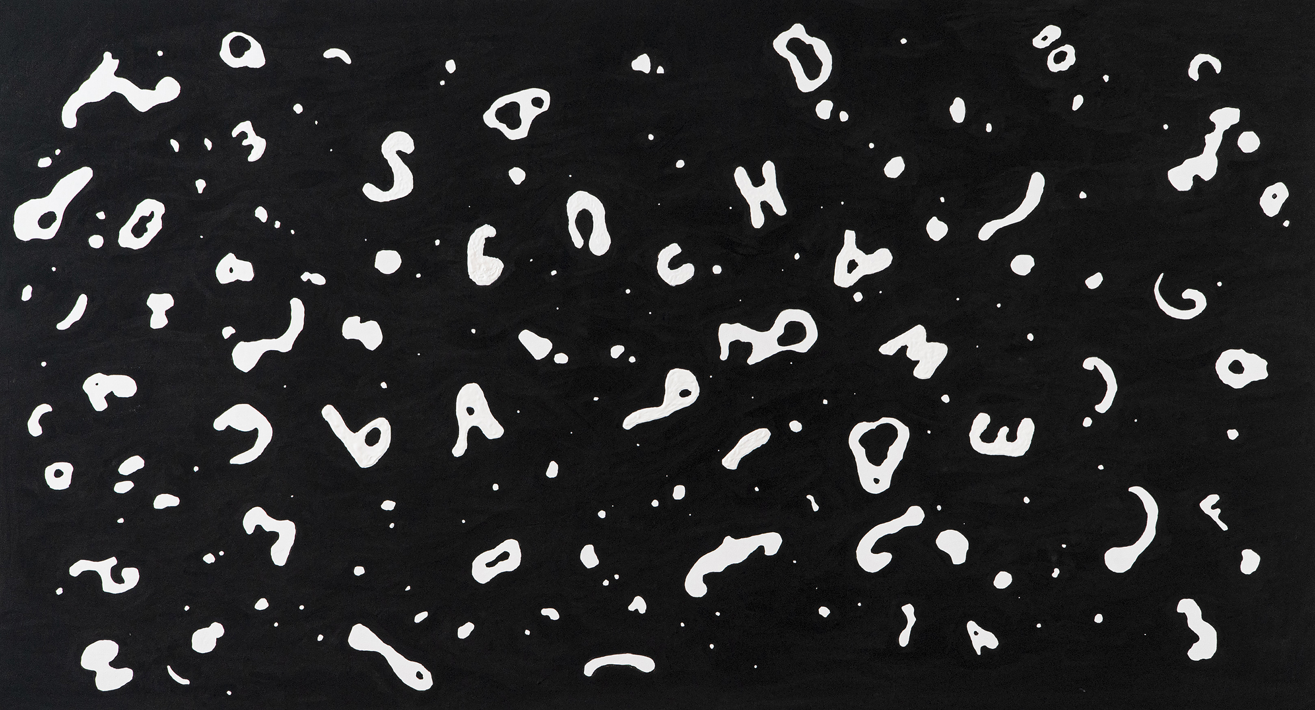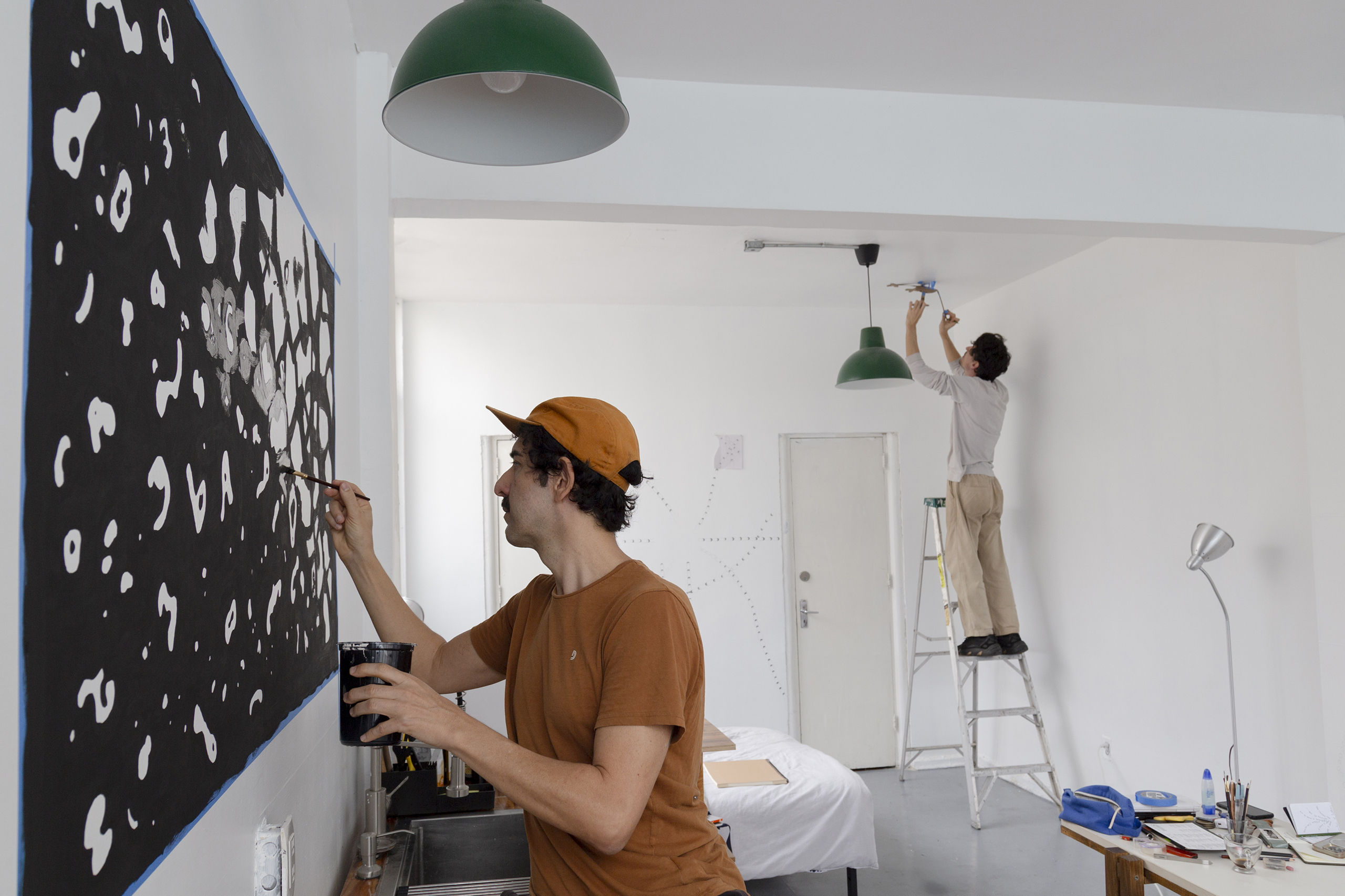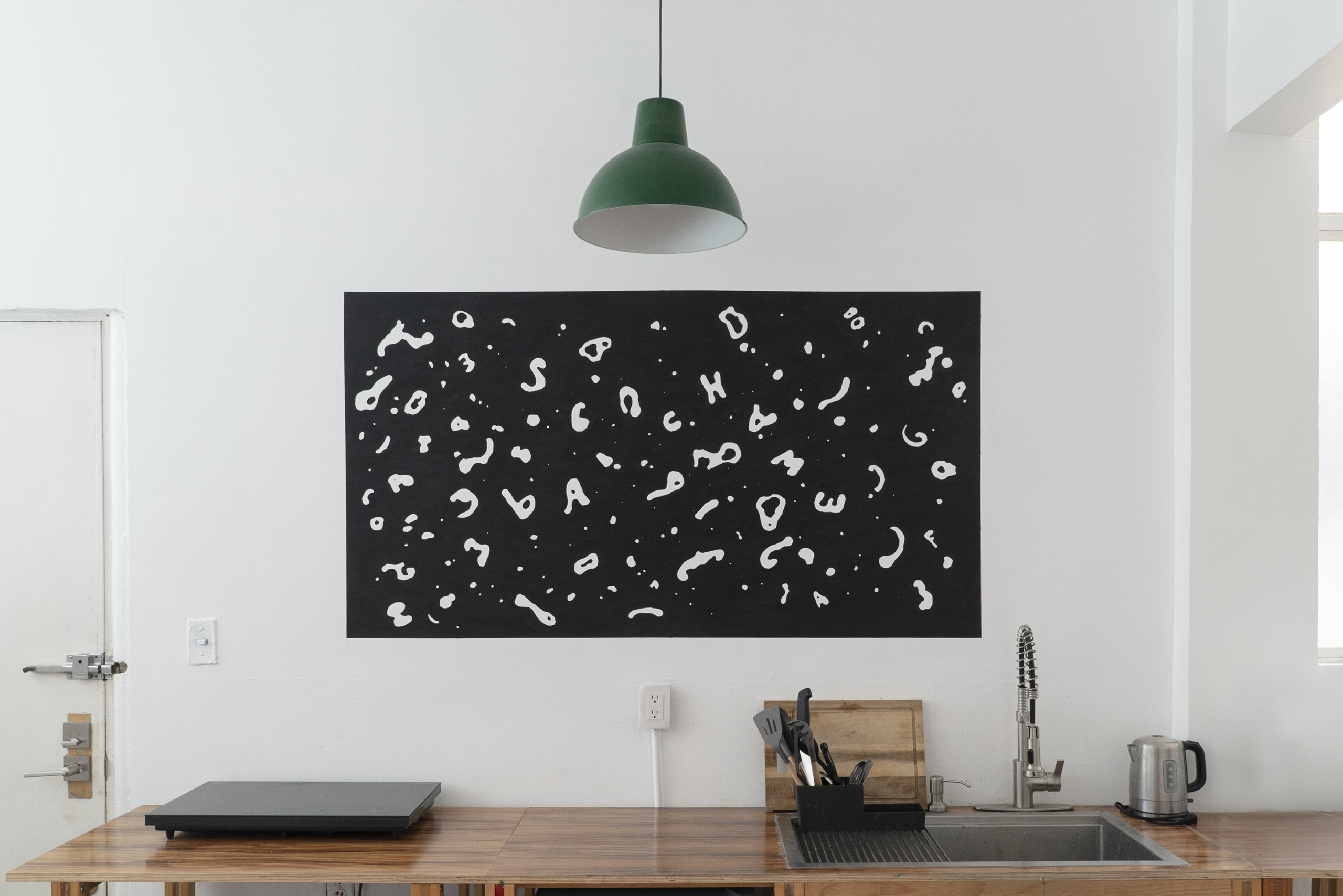 Na parede da cozinha do estúdio, apresentamos o mural ¡Escuchame papi!, feito com tinta acrílica e tinta relevo, e que traz a gramática das águas do Rio Laranjeiras, em Igatu, um rio cujas espumas de origem orgânica mudam constantemente de forma, ora revelando geometrias, ora produzindo letras, numa dança que parece ambicionar um diálogo com os visitantes que admiram a beleza obsidiana das águas que as carregam.