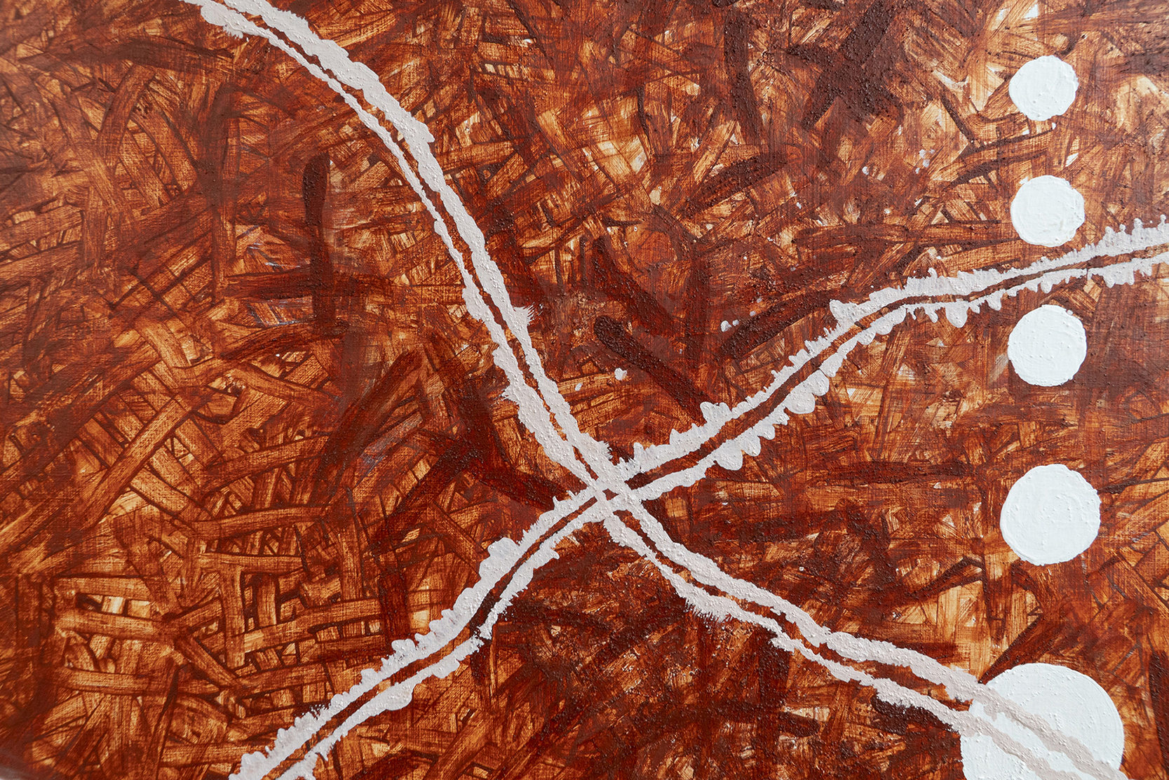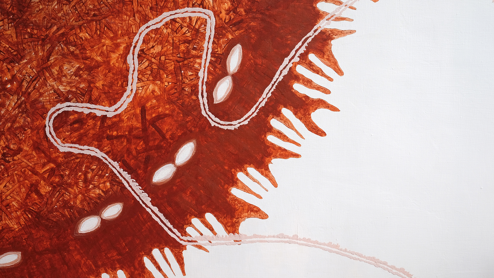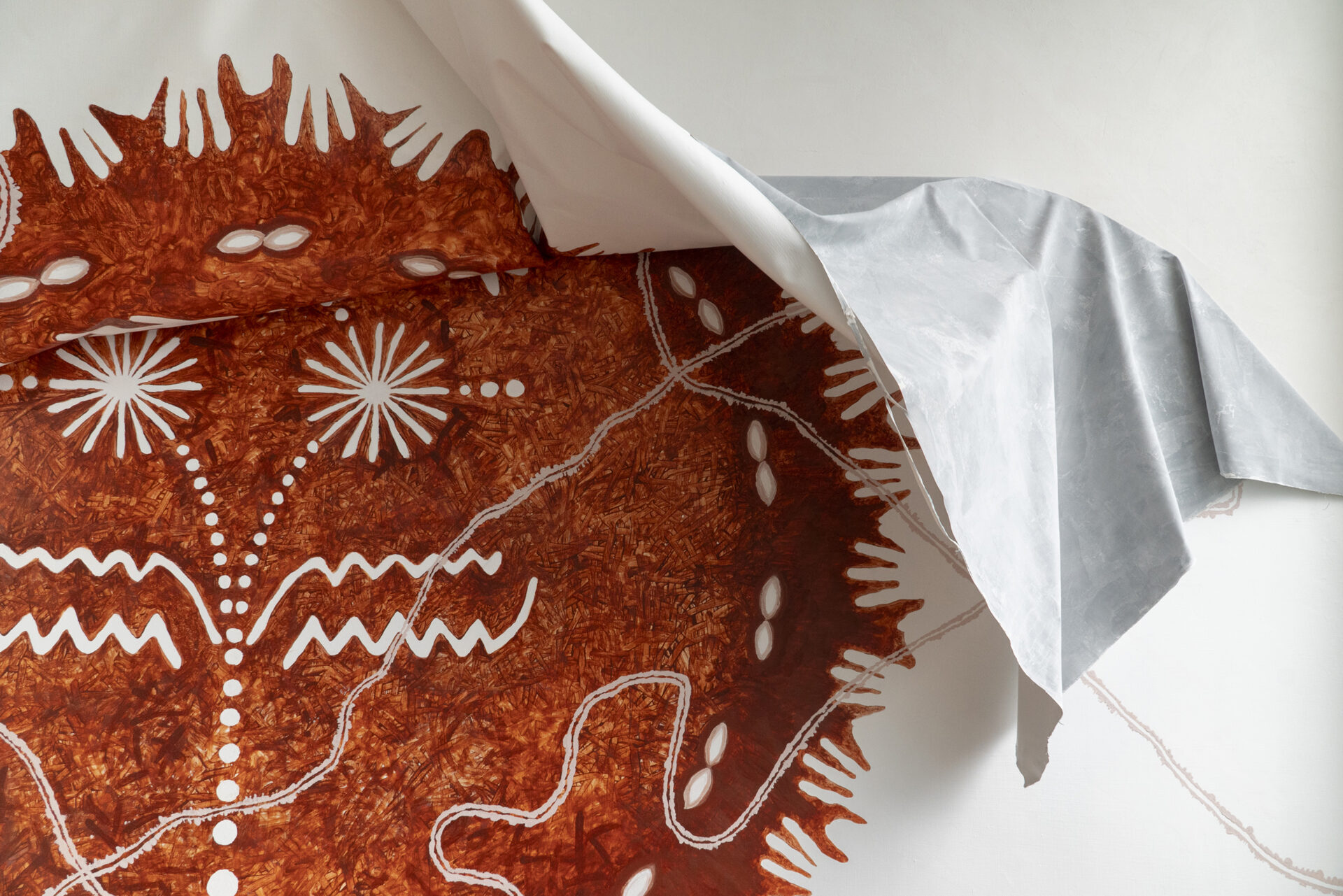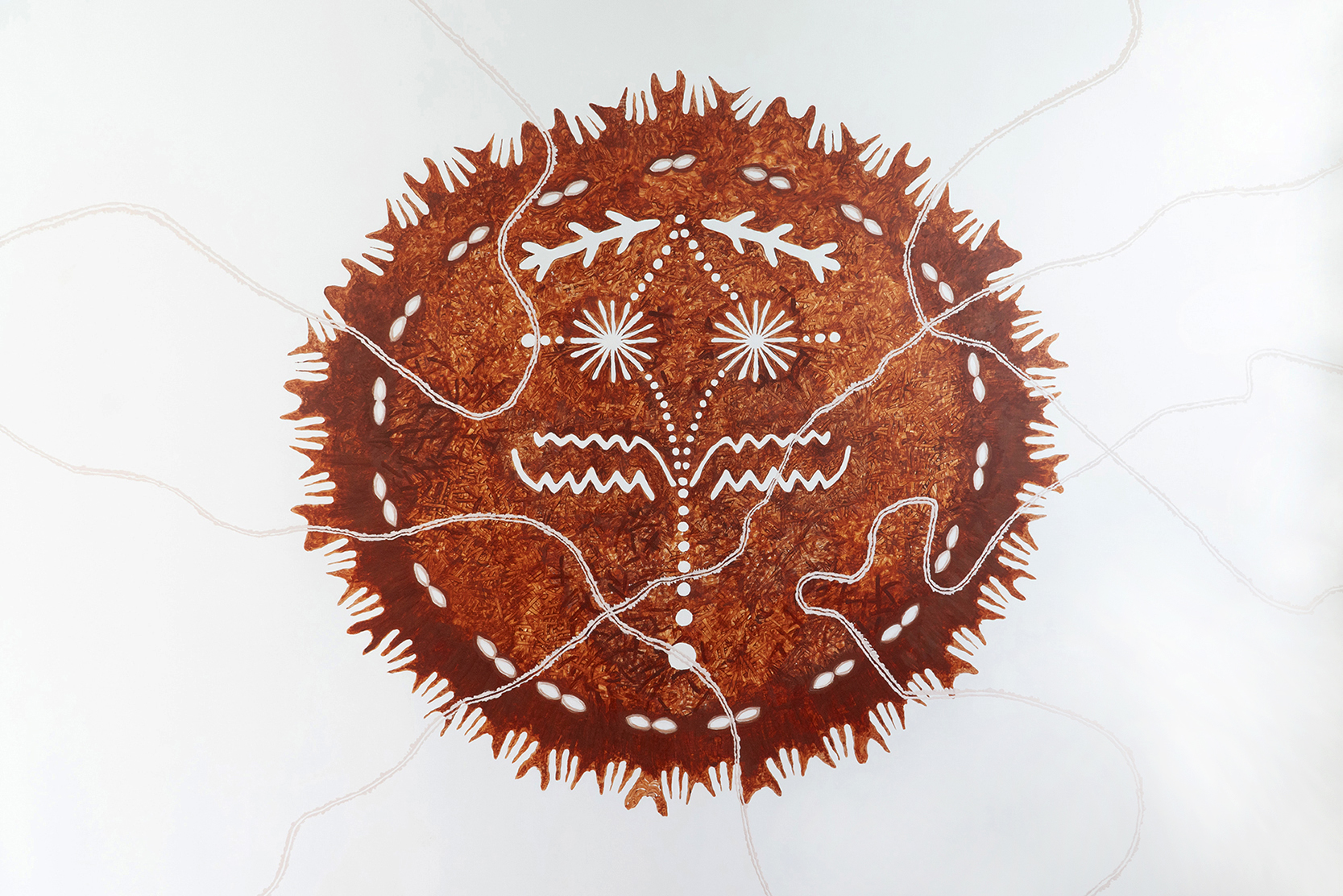 This mural was created during our latest residency in Mexico City and it was based on our cave paintings photographic archive. Since 2019, we have been documenting cave paintings in the region extending from Peruaçu (MG) to Serra da Capivara(PI), but mainly the graphical and petroglyphs sites in Chapada Diamantina (Bahia, Brazil), the territory where we work and reside. Inspired by this archive we decided for the first time to create a painting with different inscriptions which led us to the shape of a mask. Perhaps the ideia came after roaming around Anahucalli Ribera’s collection and Mexican Anthropology Museum. Using just the natural pigments collected from a cave close to our home, we painted using our fingers and hands, no brushes applied.